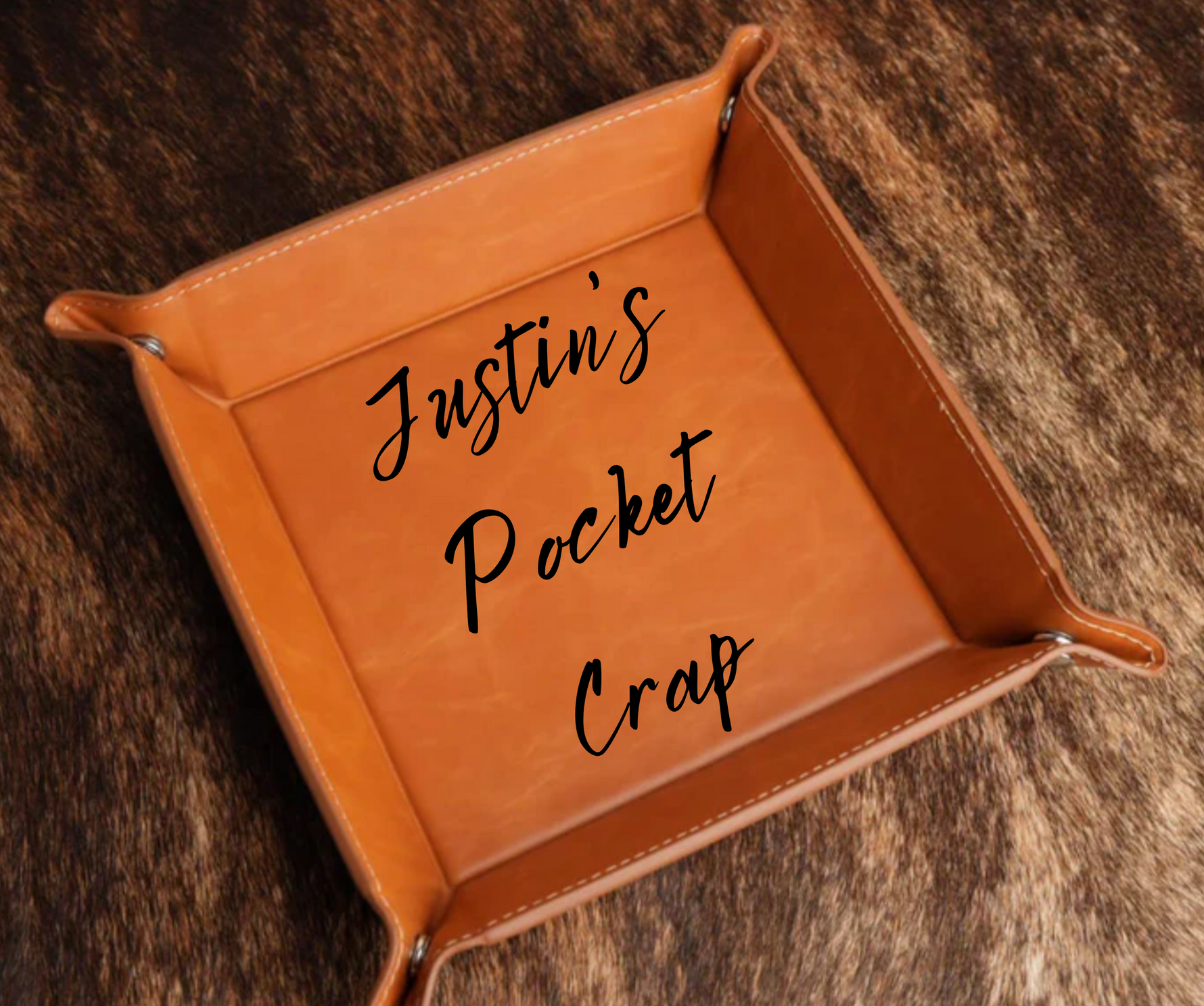 These Custom Valet Trays are made of Leatherette and bottoms and are perfect to keep your pocket content in one place when you get home. 6"x6" & 9"x9" Options. 12 Color choices