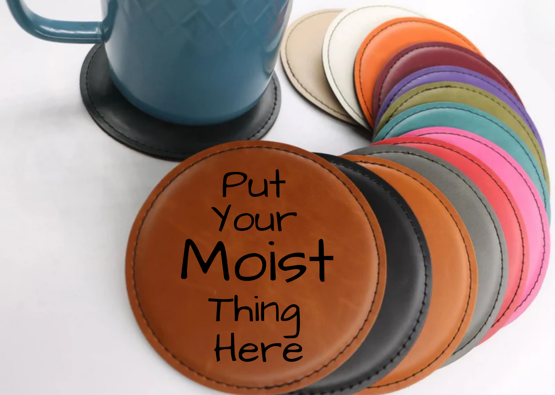 Custom Leatherette Coasters offered in about 13 color choices and either a Circle or Square. We also carry matching Leatherette Coaster Holders so they stay together at home.