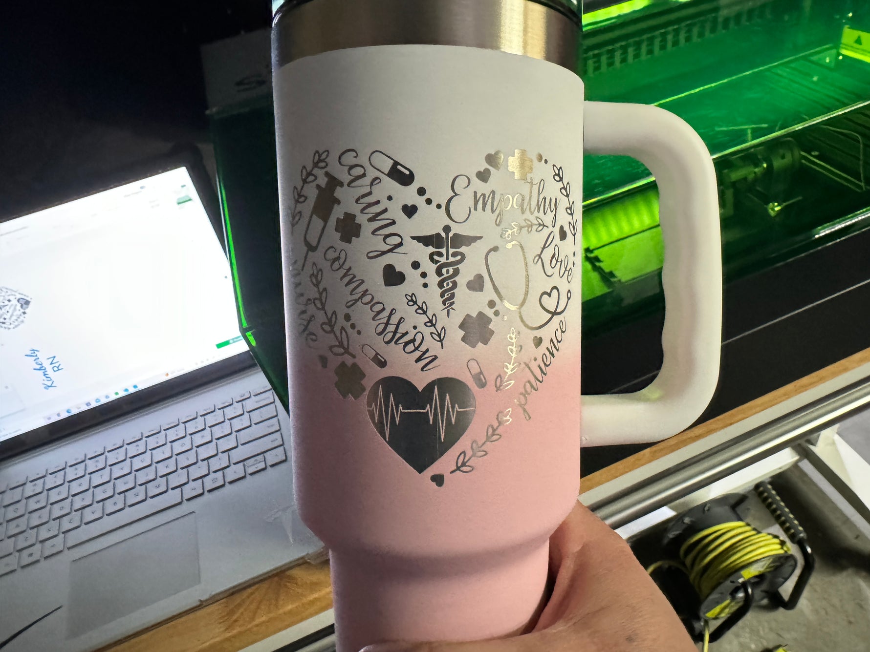 Custom Tumblers & Cups laser engraved with whatever you'd like us to put on them. We carry some cups/tumblers. We also offer you the ability to purchase your own and drop off.